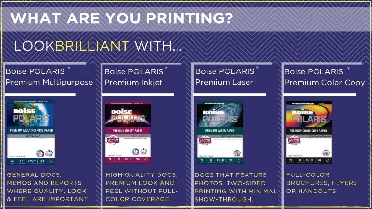 Once the entry form was complete, entrants were provided with information and tips on how Boise Paper can help them look brilliant with the full line of Boise POLARIS® papers. The grand prize winner, along with two second place winners, was announced via a Facebook Live broadcast on the Boise Paper Facebook page.