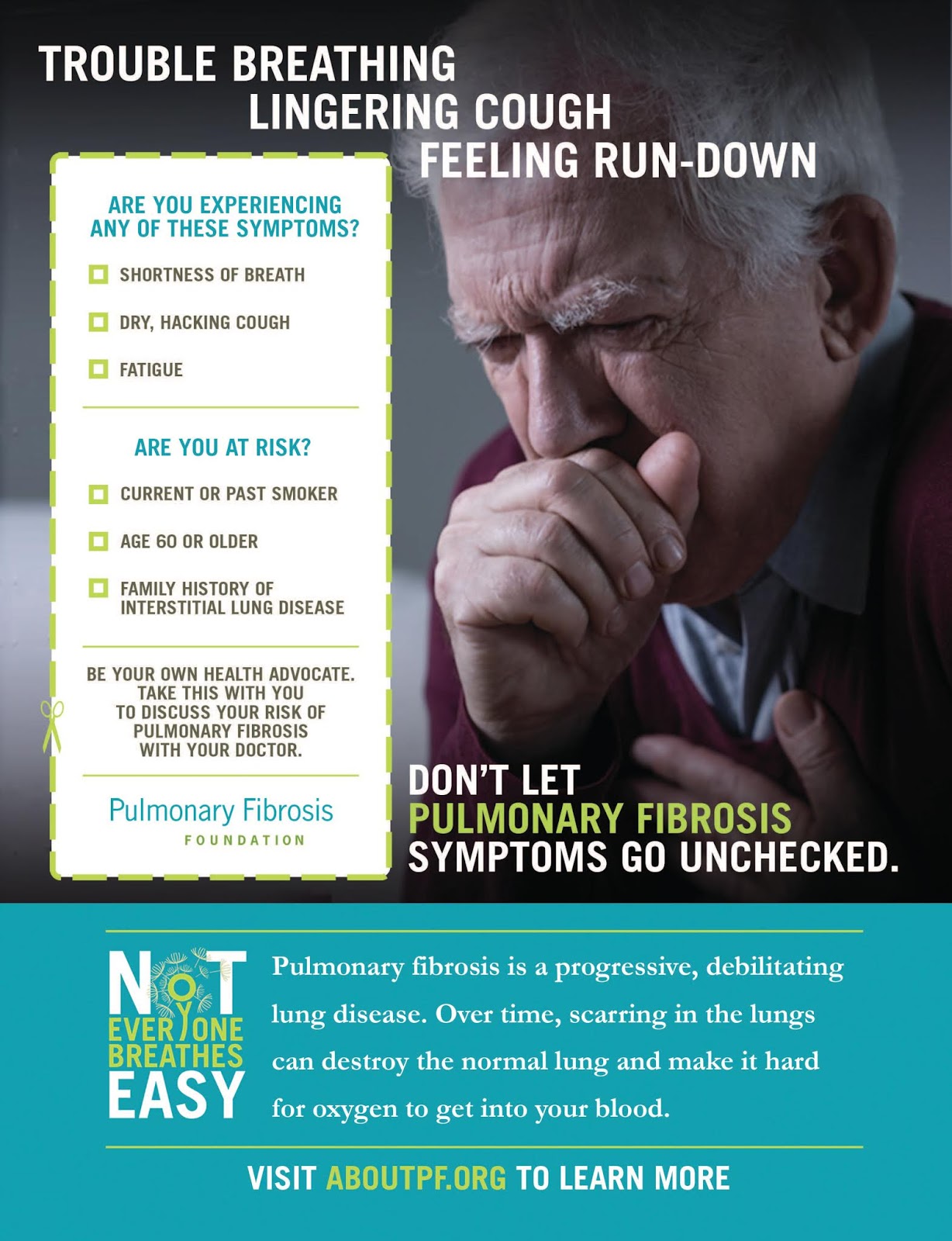 LCWA worked with the Pulmonary Fibrosis Foundation (PFF) to increase awareness about pulmonary fibrosis as part of our “Not Everyone Breathes Easy” campaign. This included securing and designing print advertisements to raise awareness about pulmonary fibrosis and the campaign with individuals who are at risk for the disease.To foster a cohesive look for the campaign, we designed a printed checklist that could be torn and carried into the doctor’s office. This created a clear call-to-action and made it easy for readers to understand what may be putting them – or a loved one – at risk for pulmonary fibrosis. Additionally, it tied to the “Not Everyone Breathes Easy” microsite, where a downloadable Risk List is available on the AboutPF.orgwebsite.